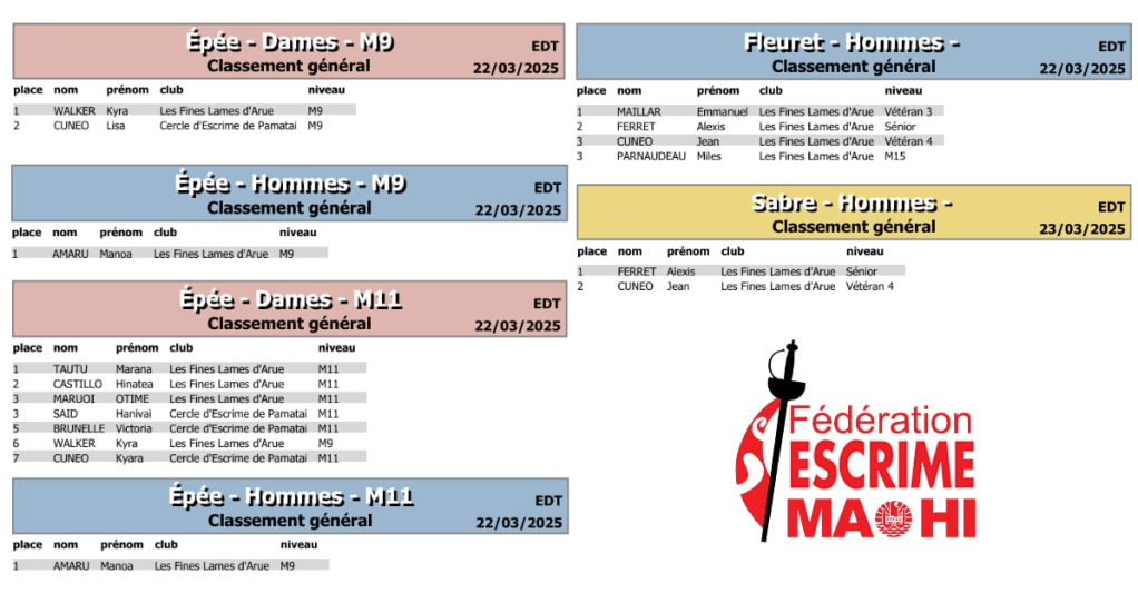 Ce Samedi 22 mars à la salle Boris Léontieff de Arue se sont déroulés les 2 journées de compétitions Organisé par le club Les Escrimeurs de Tahiti, présidé par Constant AMARU.