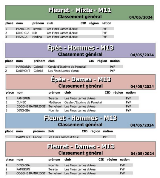 les résultats ci-joint de cette belle rencontre