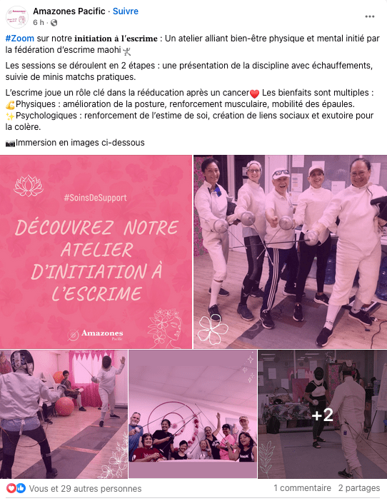 L’initiation à l’escrime proposée par la Fédération d’Escrime Ma’ohi via le programme Amazones Pacific s’inscrit pleinement dans la dynamique sport-santé. Elle offre aux participantes un double bénéfice : une rééducation physique efficace et un soutien psychologique précieux, contribuant à améliorer durablement leur qualité de vie après la maladie.