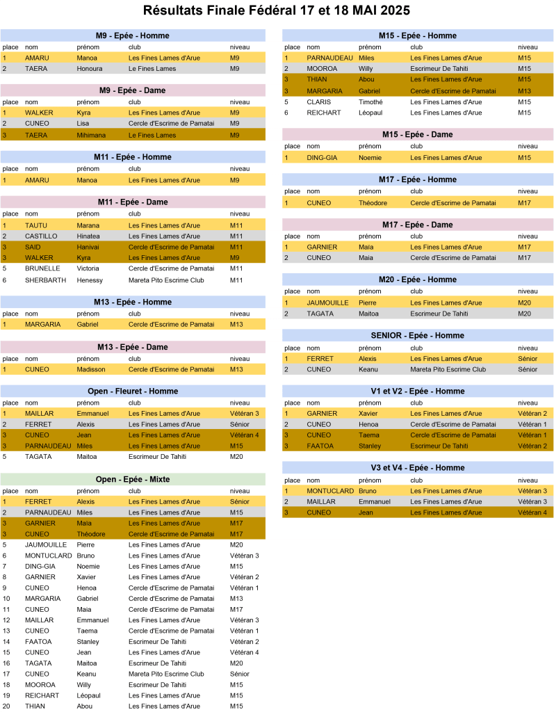 | 13 | CUNEO | Taema | Cercle d’Escrime de Pamatai | Vétéran 1 |