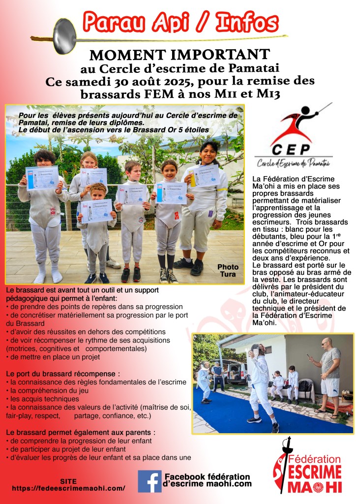 ce samedi 30 août 2025, pour la remise des brassards FEM à nos M11 et M13, pour les élèves présents aujourd’hui au Cercle d’escrime de Pamatai, remise de leurs diplômes: brassards et début de l’ascension vers le Brassard Or 5 étoiles.
