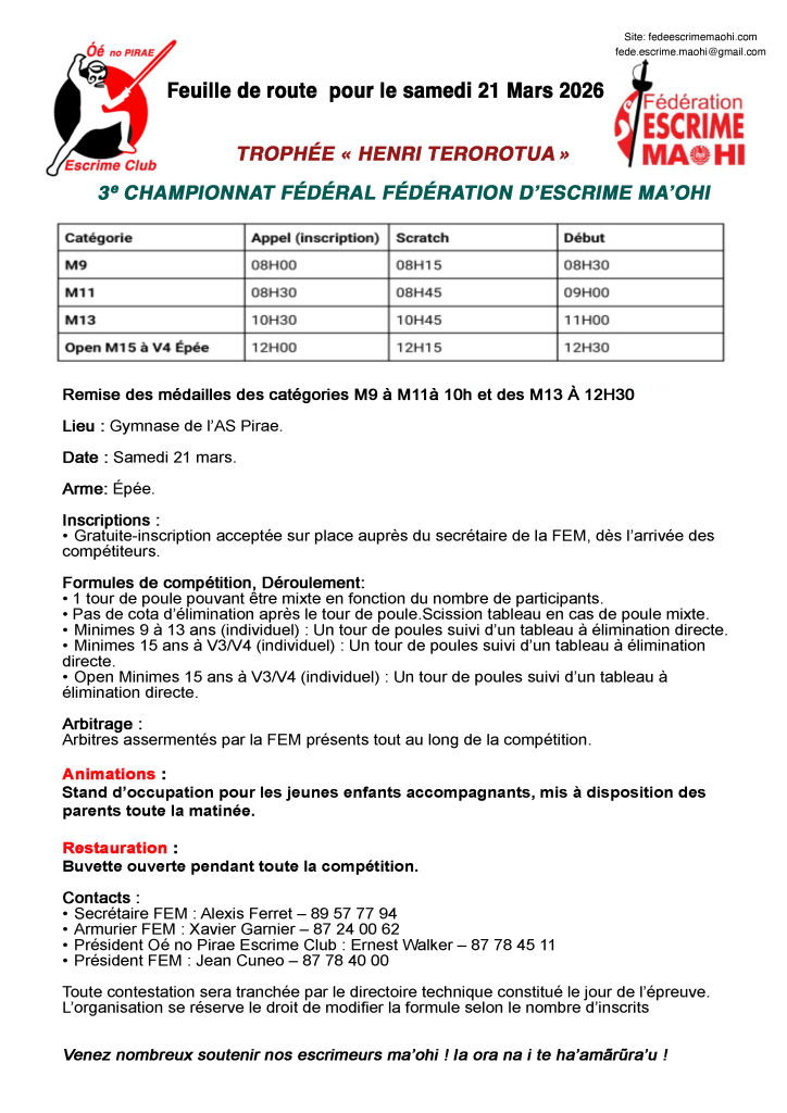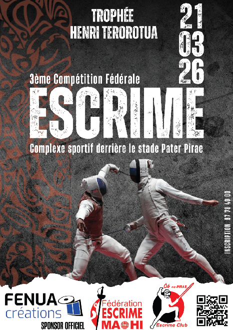 Rendez-vous le samedi 21 mars à partir de 8h au complexe sportif de Pirae, derrière le stade Pater (voir le plan de situation ci-joint) du club organisateur Oé no Pirae escrime club pour le Trophée Henri Terorortua, troisième compétition officielle d’escrime inscrite au calendrier de la Fédération d’Escrime Ma’ohi 2025/ 2026.